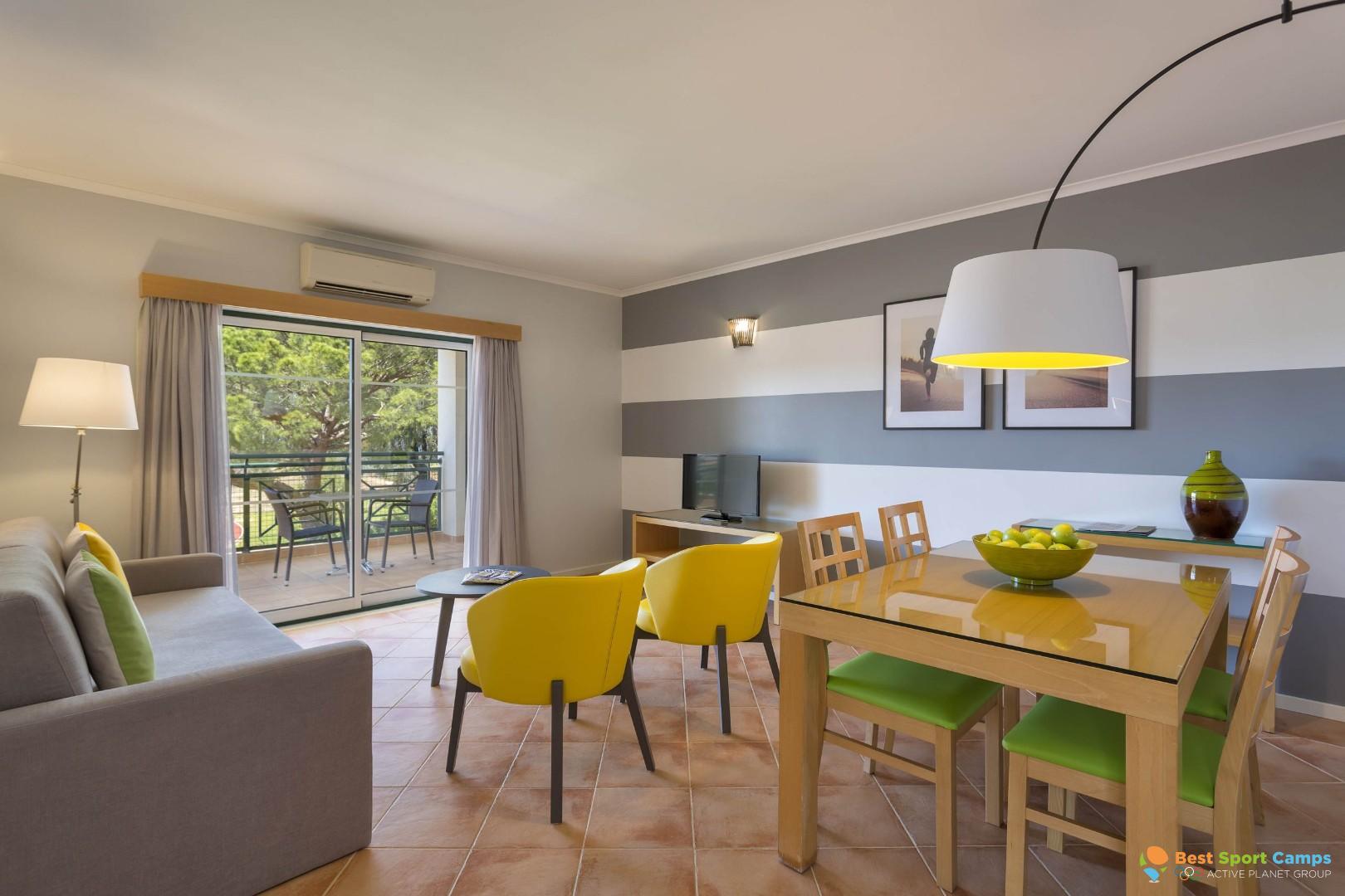 AP Victoria Sports & Beach in Albufeira, Portugal ist ein Hotel mit Sportanlagen für Gruppenaufenthalte, Teambuilding und Trainingslager. Apartment-Einheiten bieten Küchenzeile und Klimaanlage für flexible Abläufe. Restaurant und Bar übernehmen die Verpflegung; Außenpool, Kinderpool und Jacuzzi schaffen Erholung, ergänzt durch Sauna und SPA für ruhige Regeneration. Kostenloses WLAN steht im gesamten Resort bereit, die Lage zwischen Meer und Pinienwald in der Algarve ist nah an der Praia da Falésia.