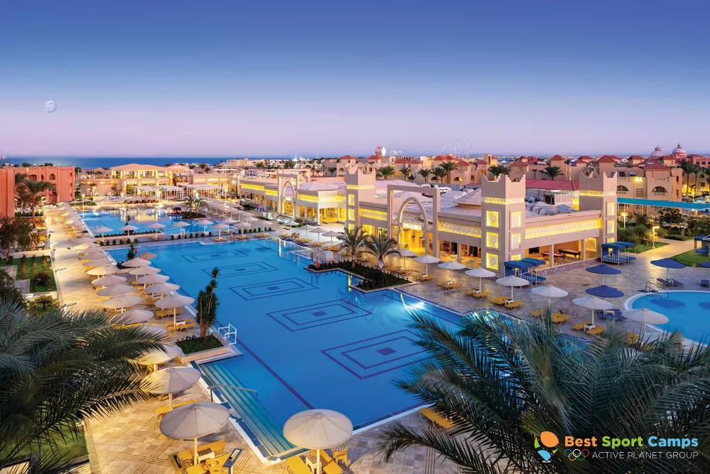 Dieses schöne und moderne 4-Sterne-All-inclusive-Resort liegt nur eine 15-minütige Fahrt vom internationalen Flughafen Hurghada entfernt. Das Hotel befindet sich weniger als 500 Meter vom Roten Meer entfernt. Unsere Teams können den kostenlosen Shuttlebus zum Strand jederzeit während des Tages nutzen. Es bietet komfortable All-inclusive-Unterkünfte, moderne große Standard-Doppel- und Dreibettzimmer oder Deluxe-Doppel- und Dreibettzimmer sowie Einzelzimmer für Trainer und Spitzensportler und ein großes Hotelgelände.